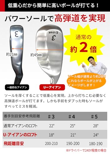 ソール幅が通常のアイアンの約2倍で低重心設計のため、上から打ち込む必要がなく高弾道でボールを上げやすく、ダフリによる大きな飛距離ロスを防げます。
