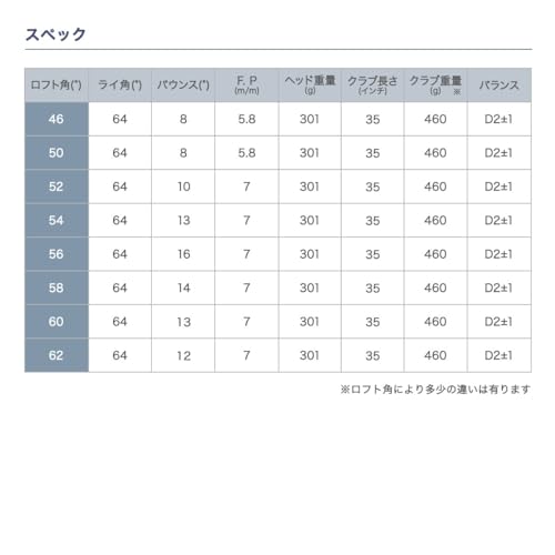 角度別の使い分けにより、様々な距離や状況に対応可能です。 - 【重量・バランス】約460g前後のクラブ重量とD2±1のバランスで、安定したスイングを実現します。